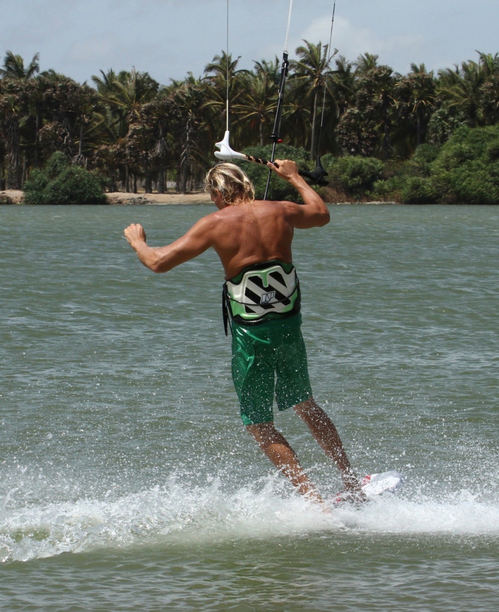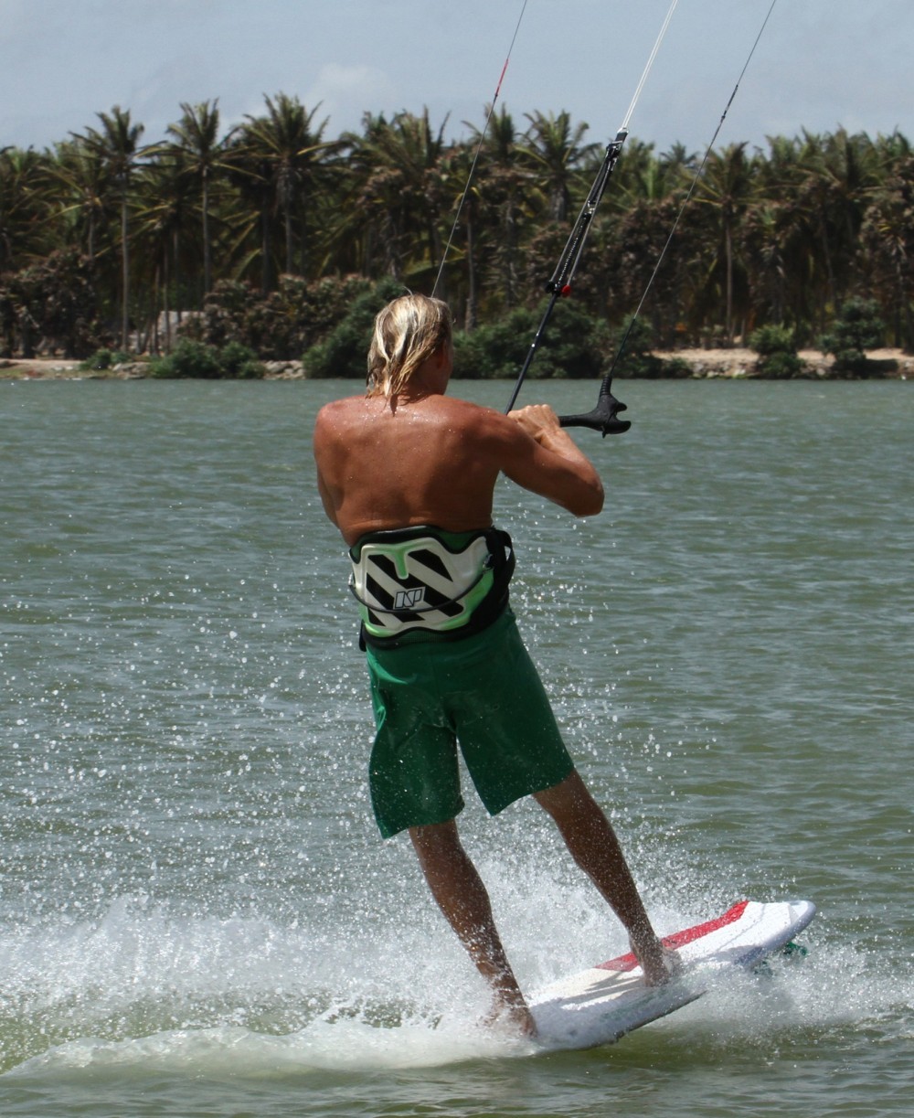 The idea here is to sail along fin first, as we did in our fin first beach start, but you could just as well transition to fin first (a very slow slide turn), or even water start fin first. Once you’re moving with your kite high you’ll turn/carve off downwind until you can grip the fins again and spin the nose of the board down and off you go toeside. Board wise it should make sense, many of us have seen surfers throwing 180 hits of the lip, landing fin first only to then twizzle (not sure of the correct technical term) back to nose first. Hopefully most of us have witnessed the likes of Keahi, Mitu, Matt or Airton stomping the same move with kites. The kite of course makes it all the more tricky, but here on the flats we can practice the last part of their move, the slide of the board and the Ole of the bar so that we’re ready, in our dreams at least, to take on some punchy shore break.