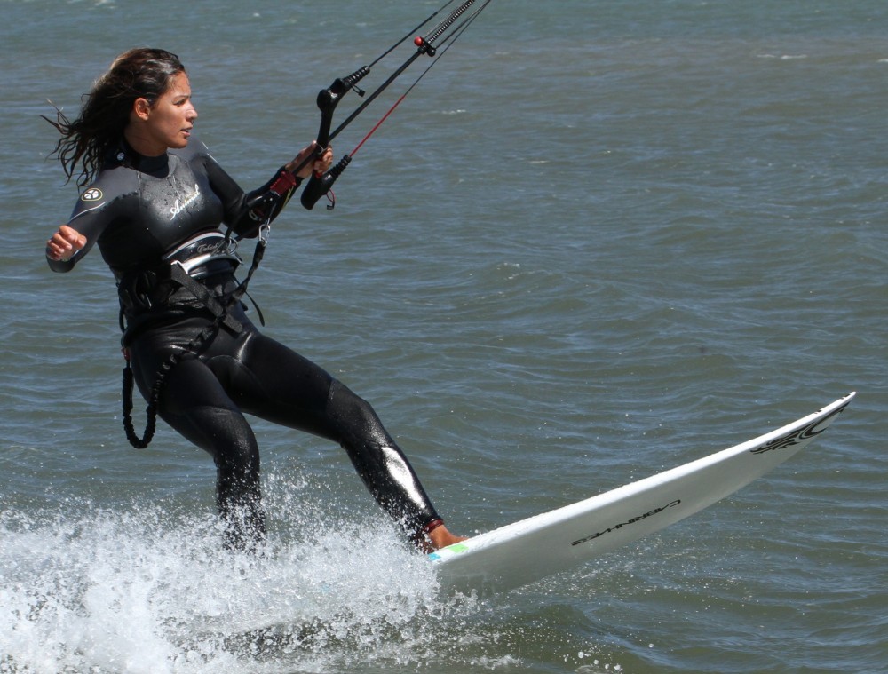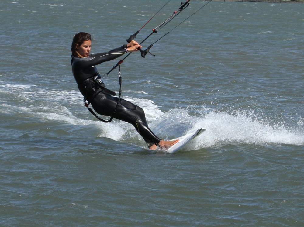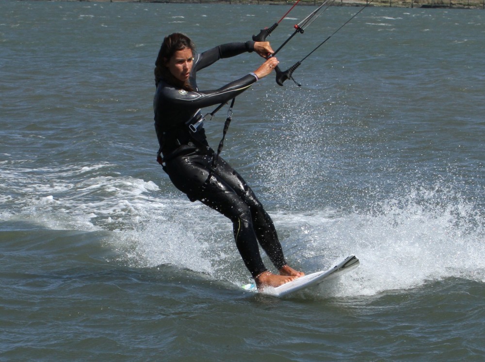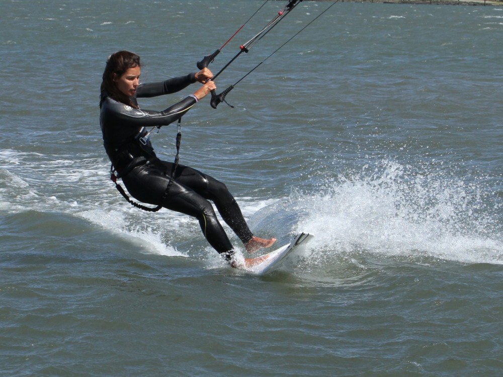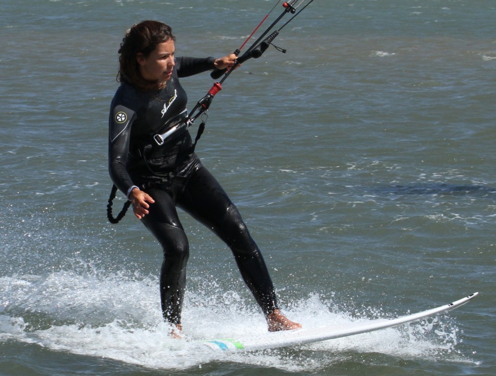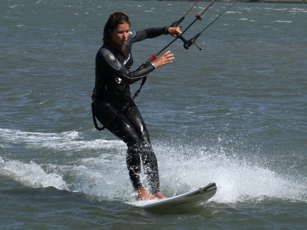 Karine has the kite about 1 o’clock, which means she can edge upwind and doesn’t feel that she’s getting lifted off the board, whilst still taking the power through her harness.