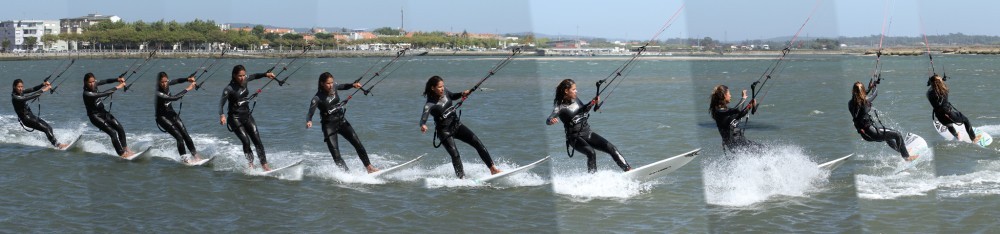 With her feet correctly positioned and the kite moving across the window Karine can turn her head and commit to the carve, with her weight to the inside of the turn. As a result of the board bearing away as you change your feet, moving your weight back over the tail, and aggressively moving the kite across the window, the continuation of the turn and a smooth exit should be well within sight.