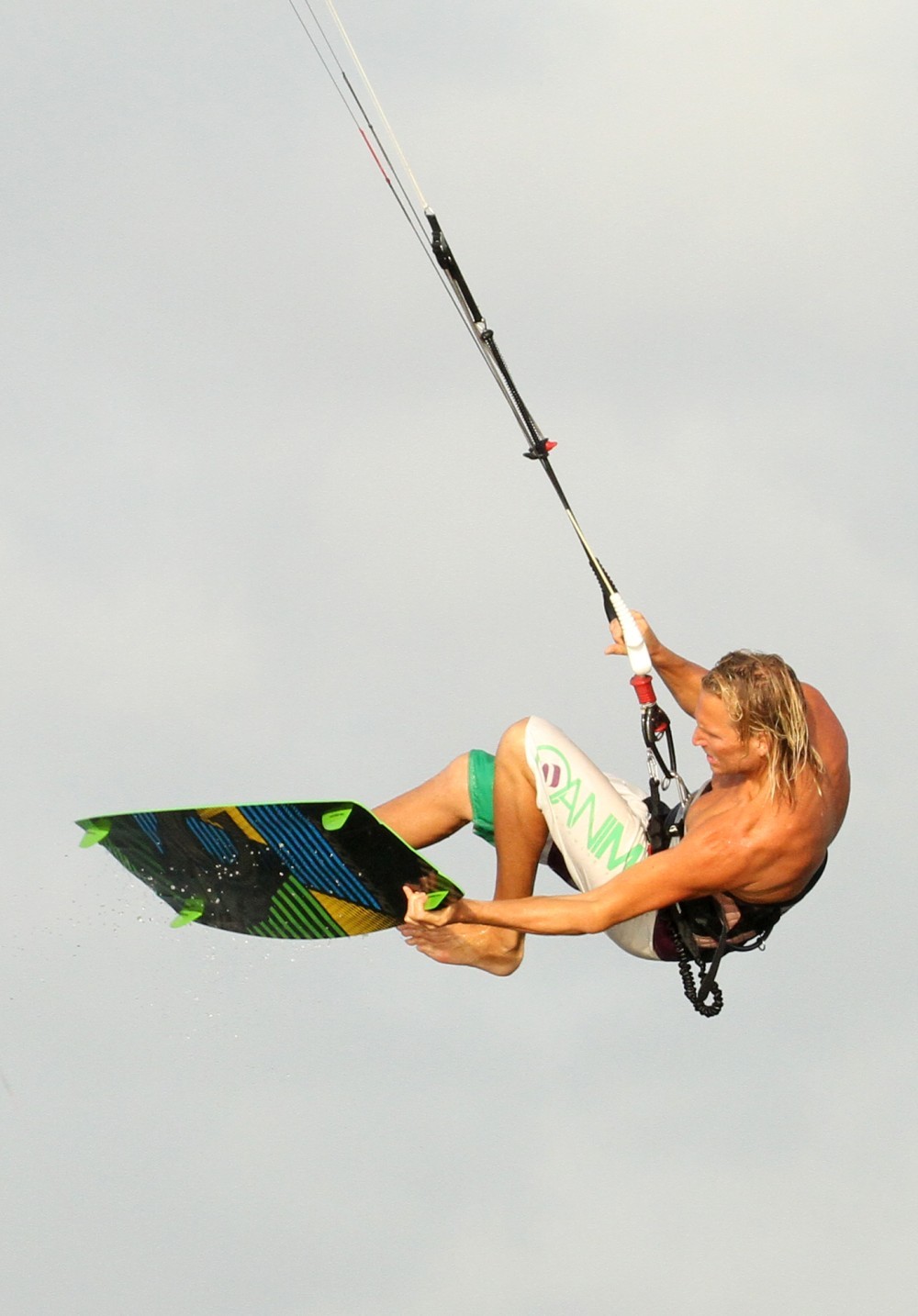 This is where your take off will really pay off. If you got your jump right and as a result the kite isn’t moving too much you’ll have the confidence and time to concentrate on getting your toes back in. If you sent the kite too far back you’ll drop quite fast, and if you didn’t send it back enough you’ll feel the kite pulling you of balance and away from the board. To start with the trick is to get your front foot into the strap, as then you can hold the board up with that foot and your hand as you push your back foot in. Whilst doing this try and keep the bar in enough so that you don’t drop. However if you feel the kite pulling you over, sheet out to compensate. As soon as you feel your back foot is in you’ll need to dive the kite hard to pull you up over the board and out of the jump, otherwise you’ll just plop down and splash. You can see that Christian is concentrating on where his feet go and not where he is going. You may find it difficult to hold the board up, but you don’t have to. If the board drops vertically beside you in the air the movement is the same, front foot first. Obviously the angle to get your foot in will be more acute but with big straps it shouldn’t be impossible.
