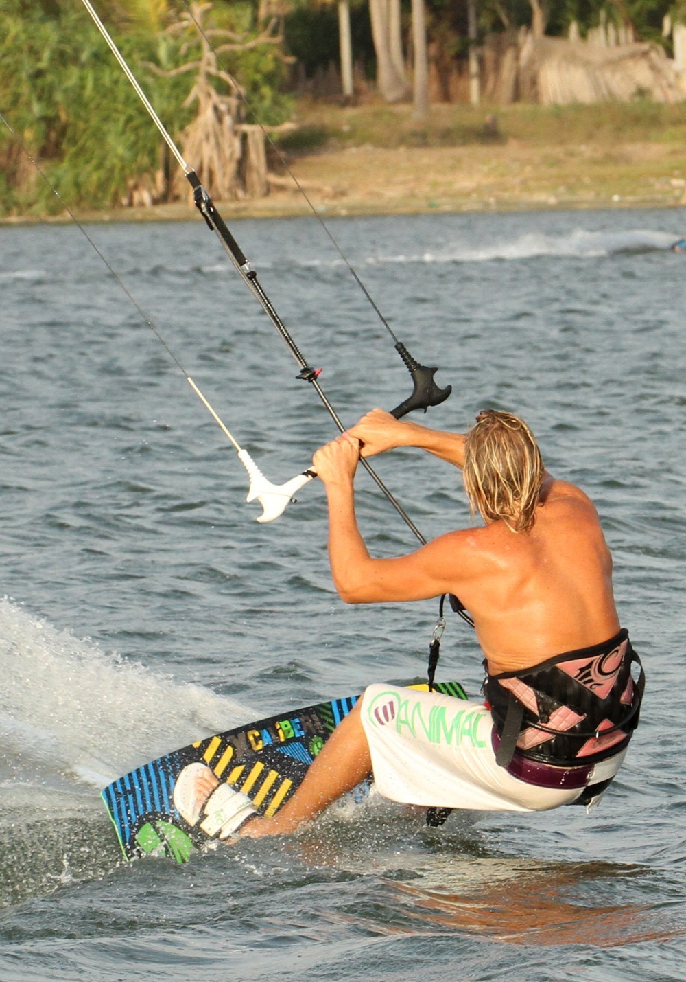Your aim, as much as it hurts to admit, is to bow jump, regardless of your kite. If you go straight up it will require much less strength and fitness to get your board up in front of you. Sending the kite aggressively results in more of a ping off the water, and with your feet trailing behind you’ll need some impressive abs to get the board where you ant it quick enough. Here we can see that Christian has sent the kite, but his bar is angled gently back, so the kite won’t go much past 12 o’clock. Also as the kite pulls on the bar Christian has let it out a touch, so that he can then pull the bar in as the kite reaches 12. However the rest is the same as normal, a good solid edge to get the kite moving up and not across the window.