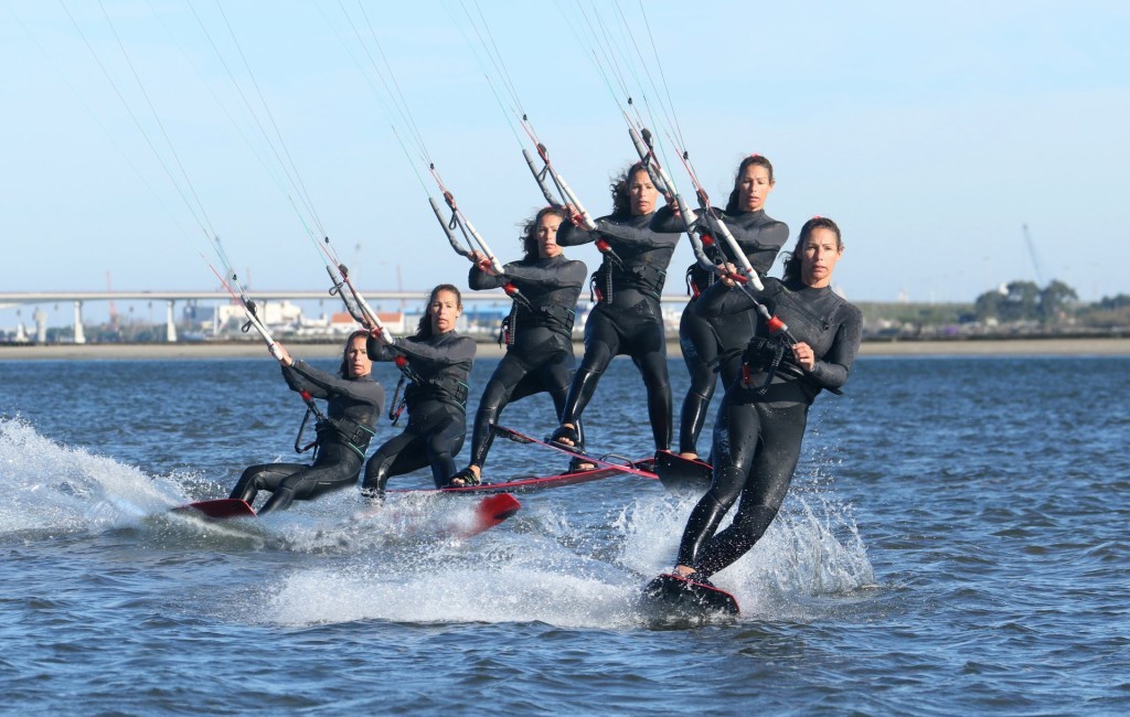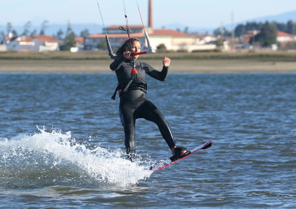 Once your board is back on the wet stuff, you can think about getting back on an edge. Keep your hips open and move your weight forwards so that you can get some pressure down through your front foot. From here on, you can flex your ankles, drive your knees across the board and edge back upwind! Or how about carving back to heel side whilst throwing buckets? If you look at the pic, Karine is now sorting herself out, ready to get back on an edge. Big hand is still leading the way, and her bar is still out on the sweet spot, as it has been throughout the move.