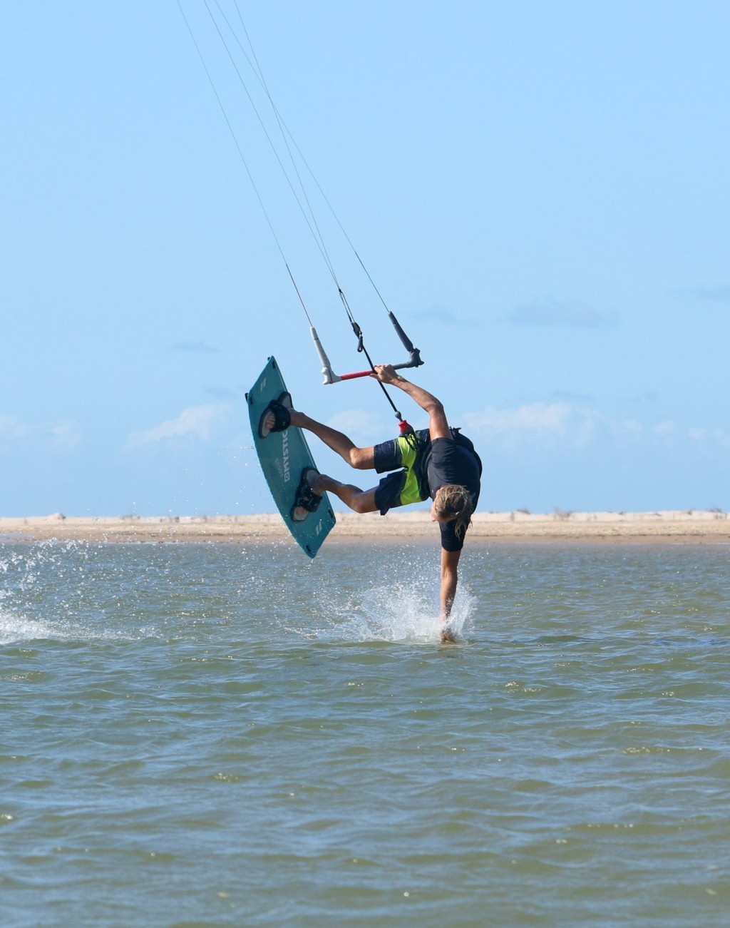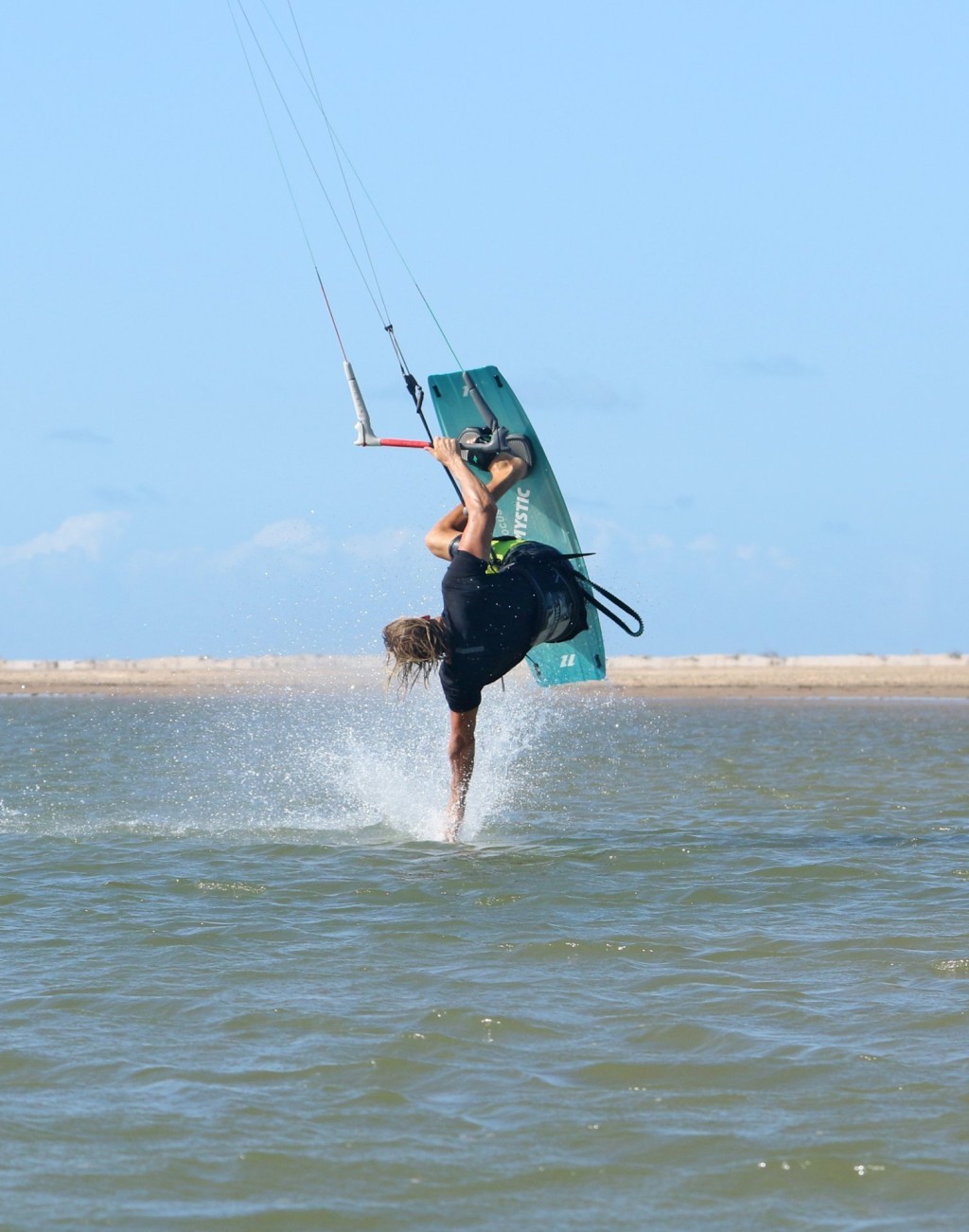 Not only is the wash for looks, it also serves a purpose. By digging your mitt into the ocean, it will slow you, and this resistance will help you rotate. Up until now Christian has not thrown his head into the rotation as his, and your, sole intention is to get the hand down into the drink and get the board up. Hence head down and feet up. Christian is looking at the water, willing himself towards it. This will only be possible with some support from the kite, so now is the time to get the bar back in and some tension back on all the lines. Ideally, you’ll do this without steering the kite, although unfortunately it’s quite feasible that as you pull the bar in the kite will steer back. If you popped early, it won’t matter as much.