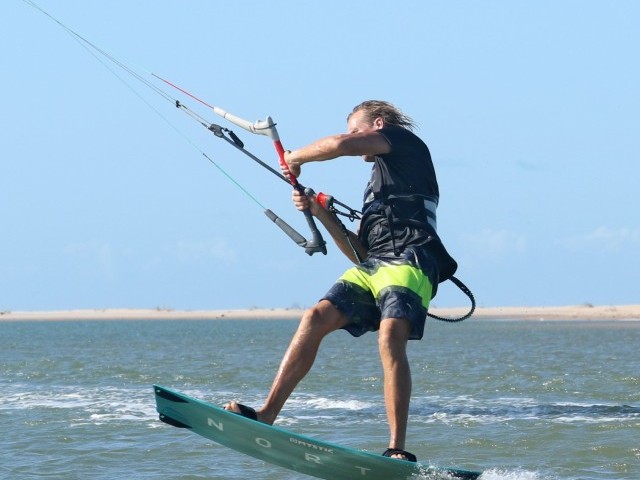 Once you’ve got a decent carve up, it’s time to explode. Ideally you’ll be stamping off just before the kite reaches 12 o’clock. Don’t wait for the kite’s lift, as once you feel it, you’ll have missed the moment. Better early than late. After all you should be leaving the water from pop and not from send! To take off, stamp vigorously off against your back foot, extending the back leg with the aim of planting your extended hand into the water. You can see that Christian has effectively kicked himself forwards towards the water. However, note that although his head and shoulders are going forwards, his legs, hips, shoulders and board are all on the way up. The rotation will come but a smidgen of height is your first priority. Final point is that his bar is fully out, as Christian doesn’t want his kite interfering with his pop.