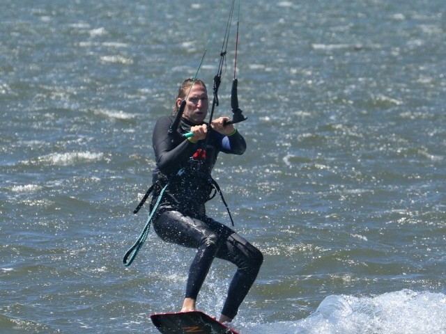 As with all toeside moves, your toeside and resultant approach will have a massive impact on what follows. With a double rotation to squeeze in, you will undoubtedly need some speed, a solid edge from which to kick, and enough time and float in the air to complete the required “twice”. If you’re a regular to these pages, you’ll know the readying drill for toe take-offs, but it never hurts to recap. To make it efficient, you have to learn to get your weight forwards, trimming the board from front to back whilst still edging. Look at the picture where you can see plenty of Christian’s board in the water. Suffice to say, you need to get your weight forwards and onto your front foot. The easiest way to do this is to open your chest and hips, facing forwards down the board so that you have a shoulder each side. This with a bent front knee, hips and head dipped forwards and both knees driving forwards, pointing in the same direction and working together. It is easier to adopt this position if you let your back foot twist in the strap and point forwards. Always the same analogy here; think of a surfer racing down the line or a slalom snowboarder in hard boots. Coming into any toeside trick, this is your approach position. From here, like Christian, you can give the kite a good send from 11 or 1 o’clock, whilst dropping your weight to counter the rising kite.