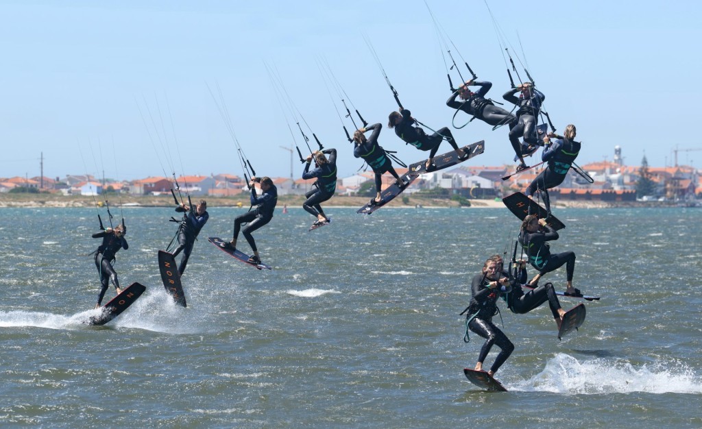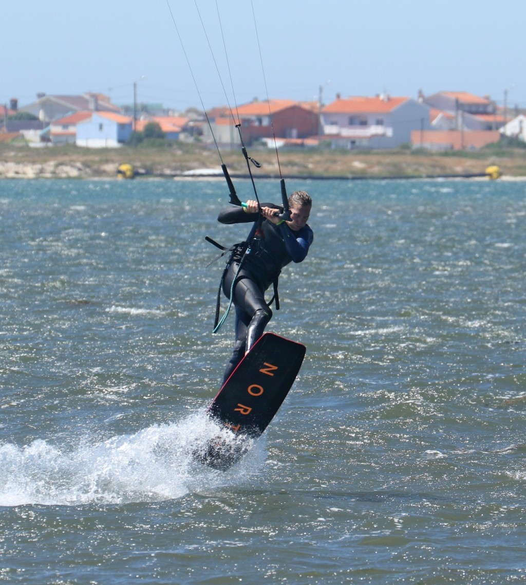 Not quite Italy vs England, but you want to at least sting the goalie’s hands. You’ve got some height to get and two spins to get around, so one mighty kick is in order. Your stamp, kick, explosion, and extension needs to be directed against your edge. This will send you up, helping the kite lift you up and around with purpose. The temptation here is to throw your head and shoulders across the board in an effort to rotate as quickly as possible. Save yourself the effort as it’ll be counterproductive. Looking at the pic, Christian has kicked hard off his back foot, extending up. It’s clear to see that even though he has already left the water, his body is still upwind of the board. This means that the send forced the kite up to 12, and he’ll get maximum bang for his buck in the rotation department. All energy harnessed, none given away charitably! He’s also levelled the bar as he doesn’t want the kite carrying on any further back than necessary. All the rotation comes from the combination of the front shoulder dipping aggressively down towards the nose of the board. This shoulder movement, combined with the pull back on the harness hook by the sending kite, will get you rolling.
