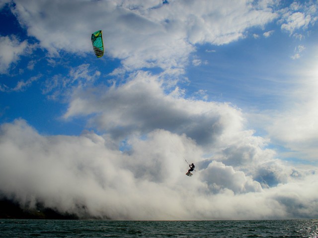 Far from the Caribbean sea, Lake Calima is in the southwest part of Colombia, 1.5 hours away from the city of Cali (population 2,300,000), capital of the state of Valle del Cauca The town next to the lake is called El Darien (pop. 18,500) and is 1,484 mts/4,872 feet above sea level, making its climate cool and sometimes chilly at night. Lake Calima is a hydroelectric artificial lake. The wind that comes from the Pacific roars up the canyon. Every afternoon (pretty reliable all year), the wind blows over the lake, creating the special phenomenon of cloud waterfall called El Brujo, The Witch. Calima has great kiting all year round!