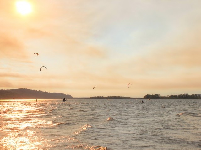 The Event Site is the busiest launch in the area and can be crowded during the summer. The Event Site provides access to a large sandbar which extends into the middle of the Columbia River. The wind can be strong, and the water conditions are mostly choppy. From the main launch, kiters can ride upwind to get away from the crowds and into cleaner swell, or downwind to find flat water and park features.