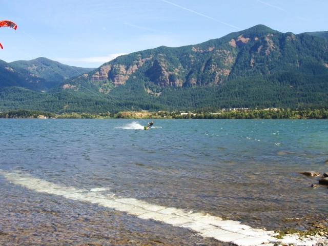 Stevenson is located 30 miles west of Hood River on the Washington side of the Columbia River. The wind at Stevenson can be steadier than other locations in the Gorge. Stevenson is a reliable site when the wind blows from east to west. The launch at Stevenson is challenging with slippery rocks and a steep bank to climb down. The conditions on the water are relatively choppy.