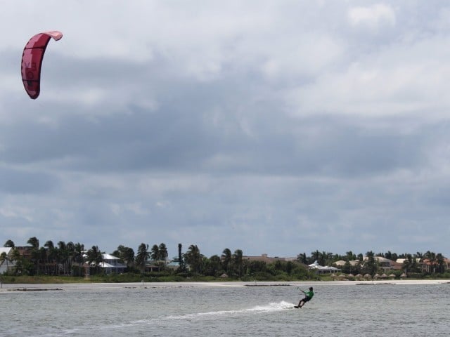 Tigertail Beach is a beautiful, white-sand beach on Florida’s Marco Island (on the Sunshine State’s west coast). It’s a unique spot, and you can kite its flat-water lagoon or easily walk across a thin strip of beach separating the lagoon from the gulf and kite the surf and chop in the Gulf of Mexico. However, it is a bit of a hike to get to the launch. If you cut through the lagoon (at low tide, it’s knee-deep, at high tide, it’s waist to chest deep), it’s a little over a mile. If you decide to walk around the southern end of the lagoon, you’re looking at almost two miles (a wheeled hand-cart to put some gear in would certainly help!). But it’s definitely worth the trek, and while the lagoon can get crowded on the weekend, it’s still big enough to have fun. Despite 16 kites being in the sky on a Saturday, I was able to find an empty cove that I had to myself for about fifteen minutes before others showed up. You can also kite from the launch to the far end of the lagoon, which is a little less than one mile.