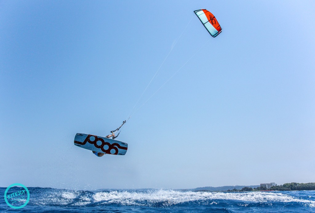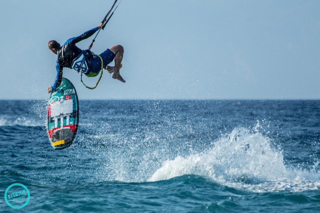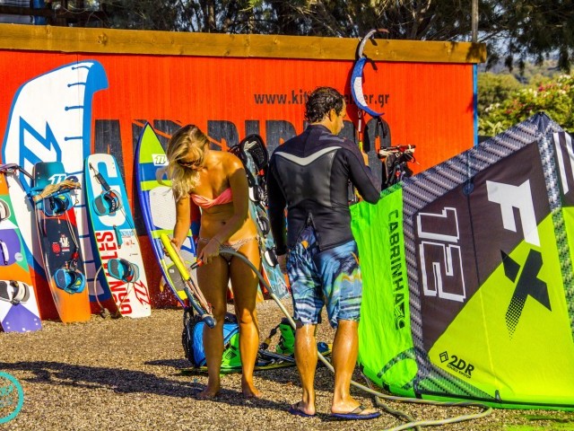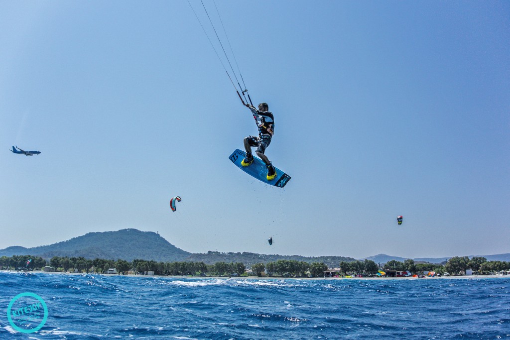 When the Meltemi starts the water stays quite flat in the beginning. The stronger the wind gets, the more chop you have on the water – but still the conditions are good for freestyle (freestyle and wake style are the main styles you find at this spot). Further outside you can enjoy the wind swell which is super fun when you grab the surfboard after you let off all the steam with the twin tip. The water is quite warm, you can expect 28, 29 degrees in the summer. So it’s no problem if you lose your board and have to swim a little.