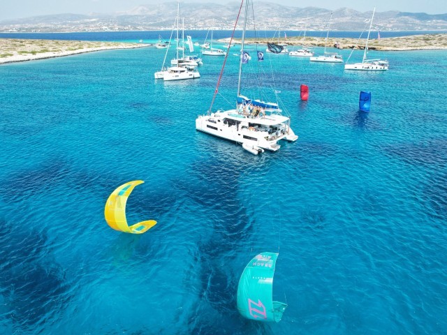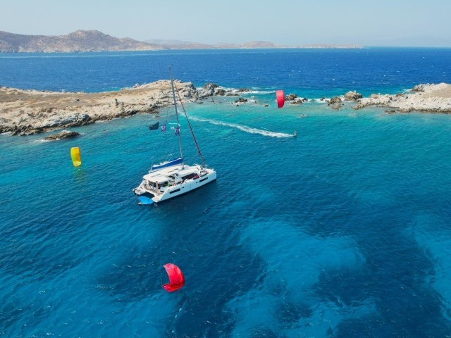 During this Kite & Sail Camp in Greece, thanks to the reliable and strong Meltemi in Cyclades islands, you will kite and wing from a sailing catamaran in unconventional and secluded kite spots, perform kite / wingfoil downwind and open sea passages, improve IKO Safety Procedures and learn basics of sailing navigation in the Magic land of Meltemi.