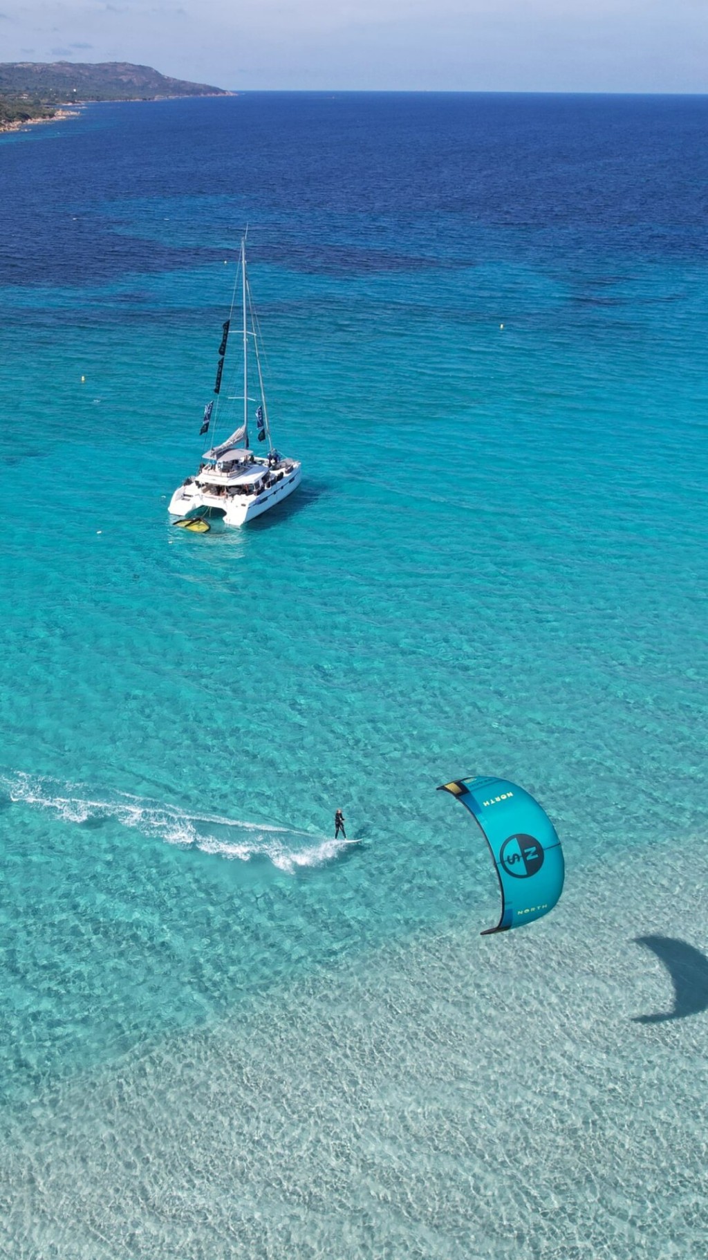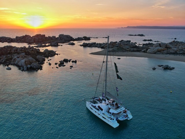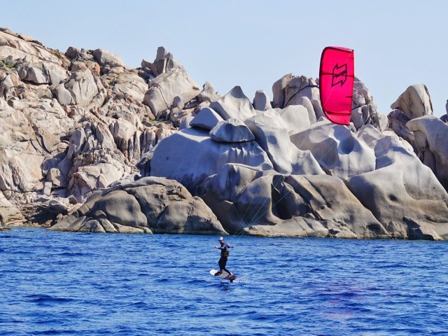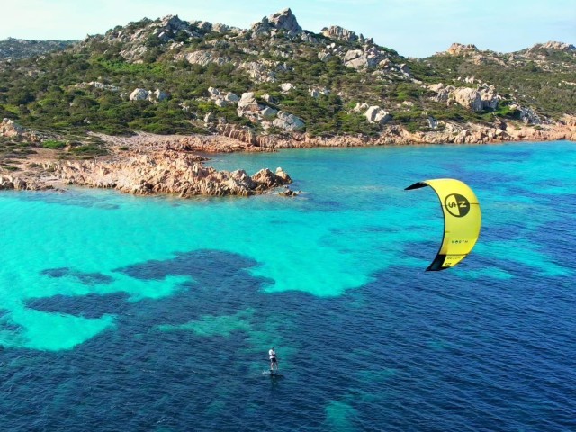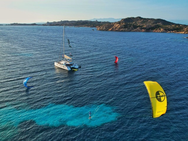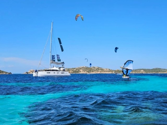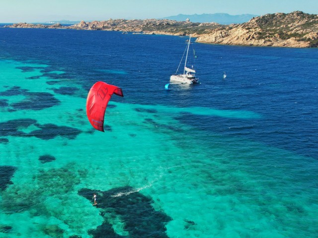 During this Kite & Sail Camp in Sardinia, thanks to the constant Mistral between North Sardinia and South Corse, you will kite and wing from a sailing catamaran in unconventional and secluded kite spots, perform kite/ wingfoil downwinds and open sea passages, improve IKO Safety Procedures and learn basics of sailing navigation in the Strait of Bonifacio Area.